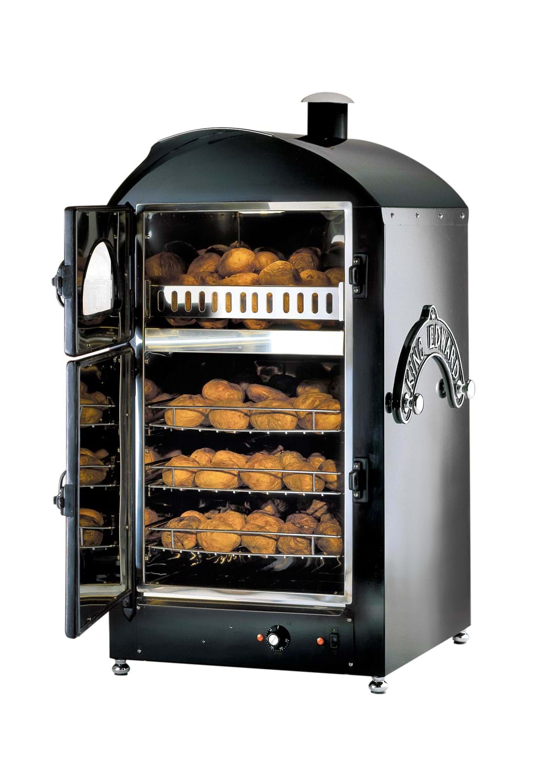 The largest oven in our range, the Majesty can accommodate 100 potatoes in the main oven, and the same amount in the top display/storage area. It is the perfect solution for those venues needing to serve a lot of potatoes in a short space of time. If you have a high volume requirement for jacket potatoes ready to serve at any one time, then the Majesty is your machine! Its highly efficient 6 6kW oven can easily produce an oven full of potatoes in 1 hour, all evenly cooked and with a lovely 'jacket' - no need to put these in foil during cooking or storage - saving you time and money! The Majesty is built to the same high standards you have come to expect from King Edward and features our own design air-flow system. Due to the weight and electrical wiring requirements we recommend that the Majesty is best located as a back bar product. For a completely 'traditional' feel, we can supply the Majesty oven with a retaining flange which would allow you to build the unit into a wall recess, thus freeing up valuable counter space and lending a period feel to any establishment.